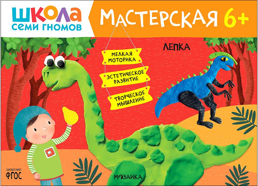 Лепка 6+ (Школа Семи Гномов. Мастерская), творческий альбом Книга «Лепка 6+» из серии «Школа Семи Гномов. Мастерская» — это красочный альбом для занятий лепкой с ребенком от 6 до 7 лет. Занятия на близкие и понятные ребенку темы расположены по мере усложнения: поступательно переходя от освоения простых навыков к более сложным заданиям, ребенок научится создавать творческую работу на бумаге с помощью пластилина. Результатом каждого занятия станет законченное произведение, которое ребенок создал сам. В конце альбома юного художника ждет большое итоговое задание, где он сможет применить все свои новые умения. Подходящий уровень сложности и полученное удовольствие от занятий — вот залог успешного обучения по системе.