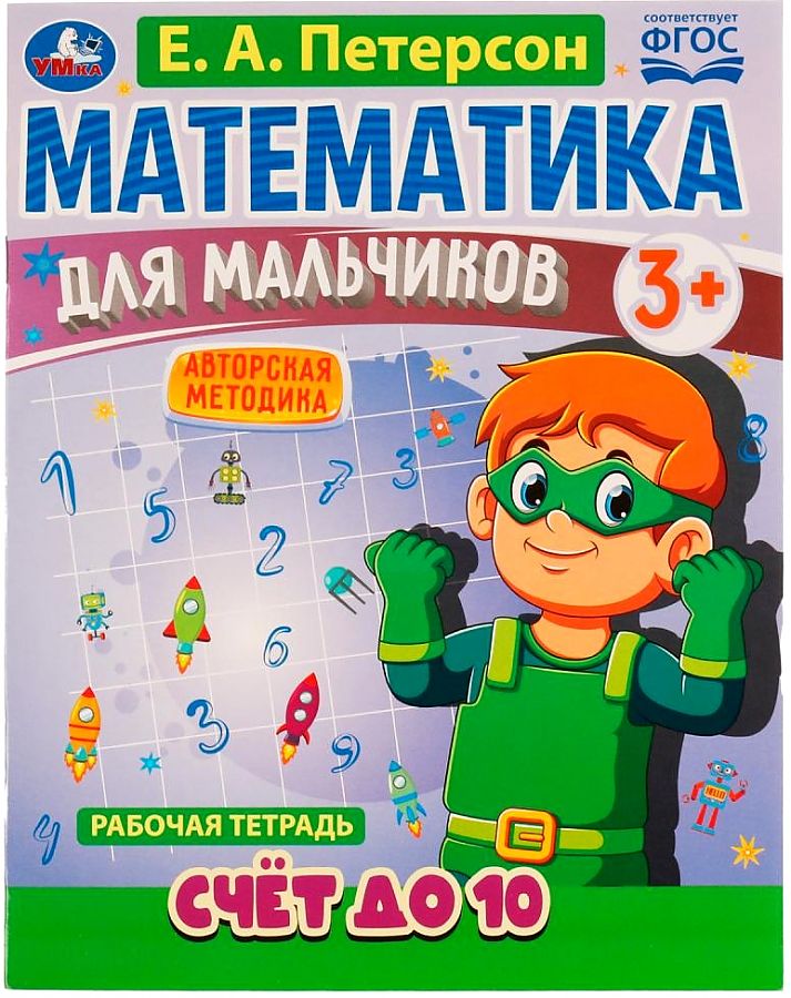 Данная рабочая тетрадь содержит комплекс увлекательных заданий по математике, разработанных в соответствии с уникальной авторской методикой Е. А. Петерсон. При их выполнении мальчики потренируются в решении простых примеров на сложение и вычитание, а также разовьют внимательность и аккуратность. Специально подобранный для юных героев иллюстративный материал сделает обучение более интересным и эффективным. Для достижения хороших результатов достаточно заниматься с ребёнком по 20-25 минут в день, главное - хвалить его за успехи!