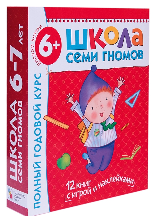 Полный годовой курс занятий 6-7 лет (комплект).Школа семи гномов - это комплексная система занятий с ребенком от рождения до поступления в школу, по 12 красочных развивающих пособий на каждый год жизни ребенка-дошкольника.Для каждого возраста свой цвет, свой гномик, свои книги. Так, например, у всех книжек для детей в возрасте 6-7 лет красные обложки. Семь лет до школы - семь цветов радуги.Пособия разработаны в соответствии с современными образовательными стандартами и будут полезны как родителям, так и специалистам: воспитателям, методистам, гувернерам.В комплект входят книги:- Счет. Форма. Величина- Логика. Мышление- Дошкольные прописи- Время. Пространство- Уроки грамоты- Уроки этики- Как жили наши предки- Народы мира- Где живут предлоги?- Чтение с увлечением- Экология для малышей- Тесты для подготовки к школе